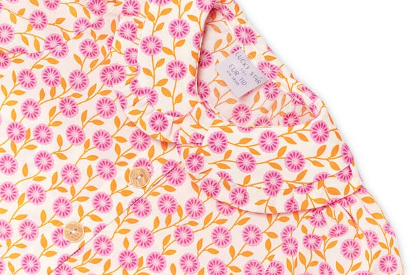 Zestaw z lekkiej bawełny w kwiatowy print. Bluzka z zaokrąglonym kołnierzykiem i bufkami w połączeniu z krótkimi spodenkami tworzy dziewczęcy, dopracowany look. Idealny na słoneczne dni i wyjątkowe wyjścia.
